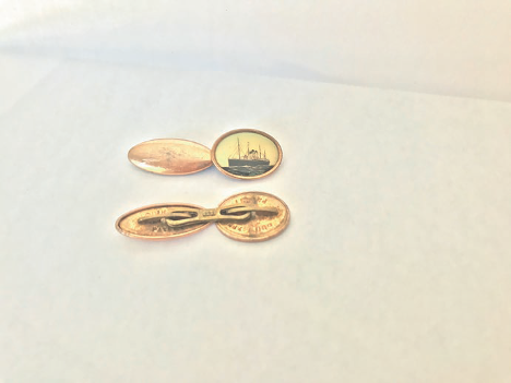 While I have found this family legend to be false, these objects are still a puzzle to me: why do I have them, how did my grandfather get them, what is the ship pictured on them (if not the Corinthian) and why would he hold onto them well past the time he retired from professional life? Maybe they were a gift from someone else? Did he find them in a secondhand store or charity shop? Was it then that he slyly spun the tale? I am especially intrigued by the English provenance of the cufflinks. My grandfather never left the United States after he emigrated, so far as I know, and while purchasing British-made items in the middle of America is not unheard of, my research showed me that these cufflinks were originally purchased, in all likelihood, on board a transatlantic carrier. They were likely originally a part of a set that included a tie clip; I found just such a set on eBay depicting a different ship. Owen and Sons, I can speculate, had an agreement with these carriers to produce souvenir cufflinks and tie-clips depicting voyaging vessels. It was a good way for the young company to place its products. This must have been how my cufflinks were originally purchased, the tie clip now lost to time.